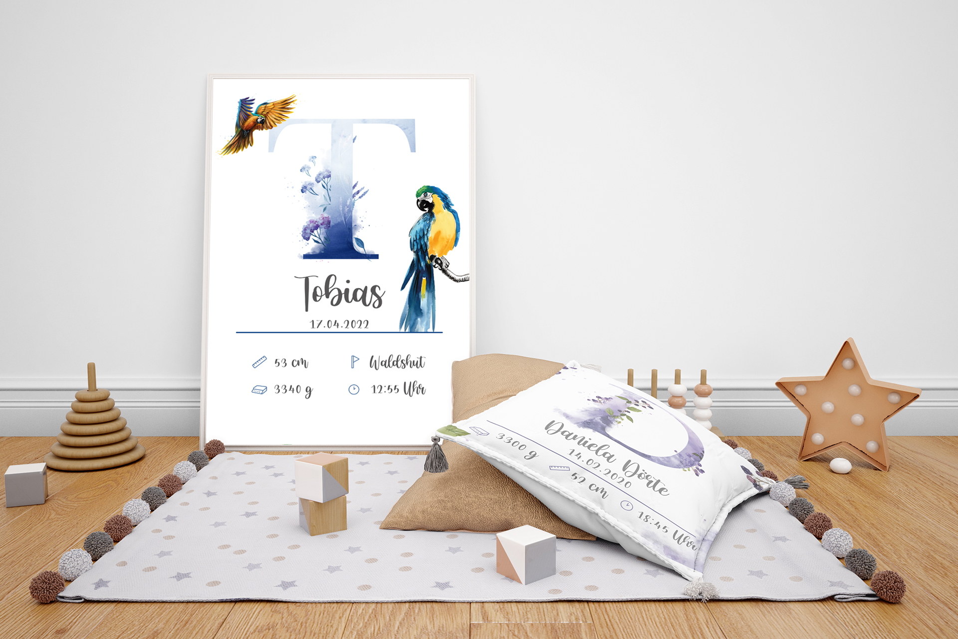 Das perfekte Geschenk zur Geburt, egal ob Kissen, Decke, Poster und vieles mehr. Wir können das Design auf jedes Produkt bringen.